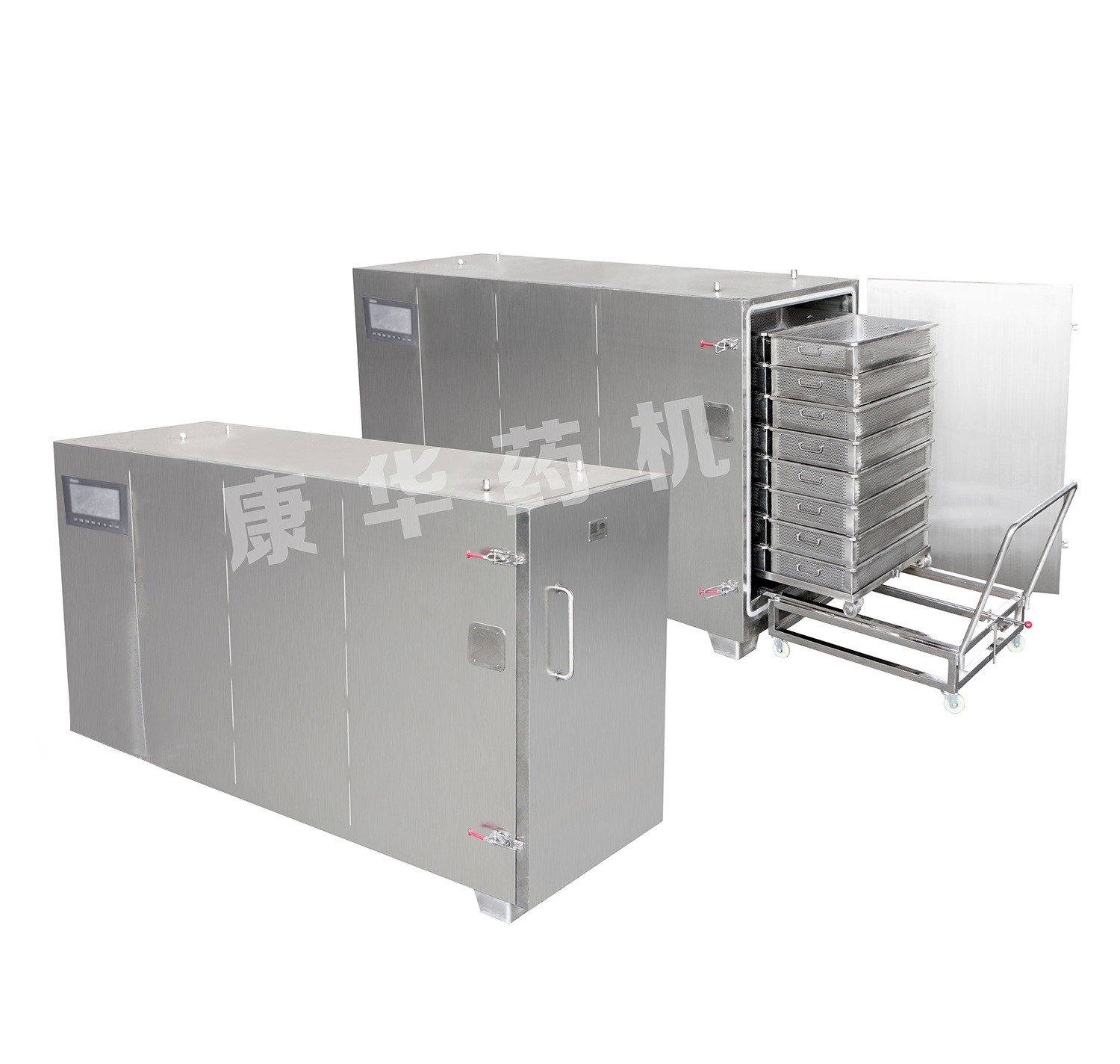 工作原理:由人工將堆放在料箱內(nèi)的物料推入方形箱體內(nèi),手動(dòng)關(guān)閉箱門,抽真空、保持箱內(nèi)真空度、進(jìn)汽蒸潤(rùn)、停機(jī)、開(kāi)門出料。根據(jù)不同的物料,設(shè)定不同的潤(rùn)藥溫度